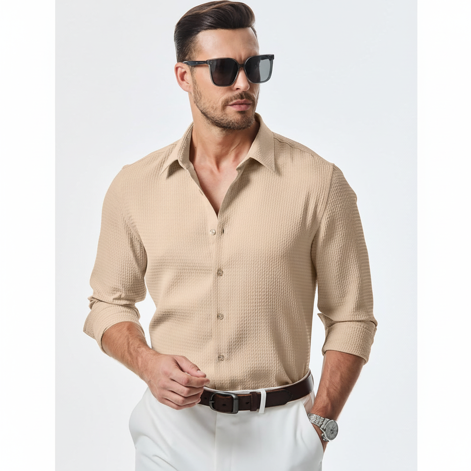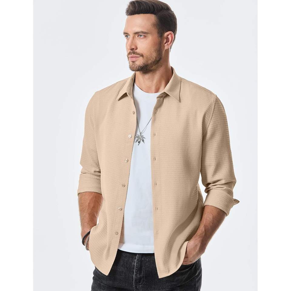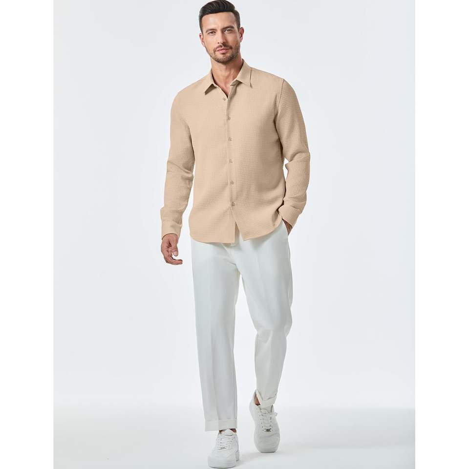 2025ชุดเดรสทำงานลำลองสำหรับผู้ชายชุดเดรสแขนยาวมีกระดุมทรงวาฟเฟิลกระดุมขนาด XL ผ้าฝ้าย100% กระดุมแถวเดียวแฟชั่น