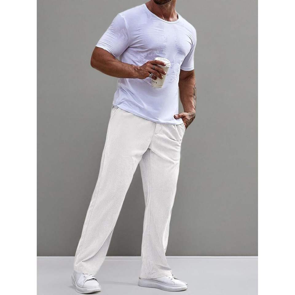 กางเกงผ้าลูกฟูกของผู้ชาย2025กางเกงจับจีบขาตรงเอวยางยืดมีซิปป้องกันรอยยับกระเป๋าทรงหลวม