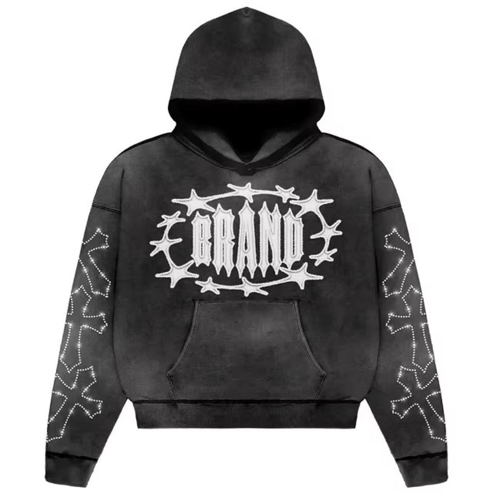 2025มีฮู้ดสำหรับผู้ชายพิมพ์โลโก้แบรนด์ตามสั่งของผู้ชายเสื้อฮู้ดโอเวอร์ไซส์ประดับพลอยเทียมแบบลำลองสำหรับทุกเพศ