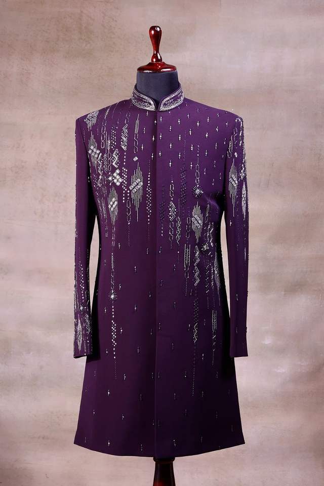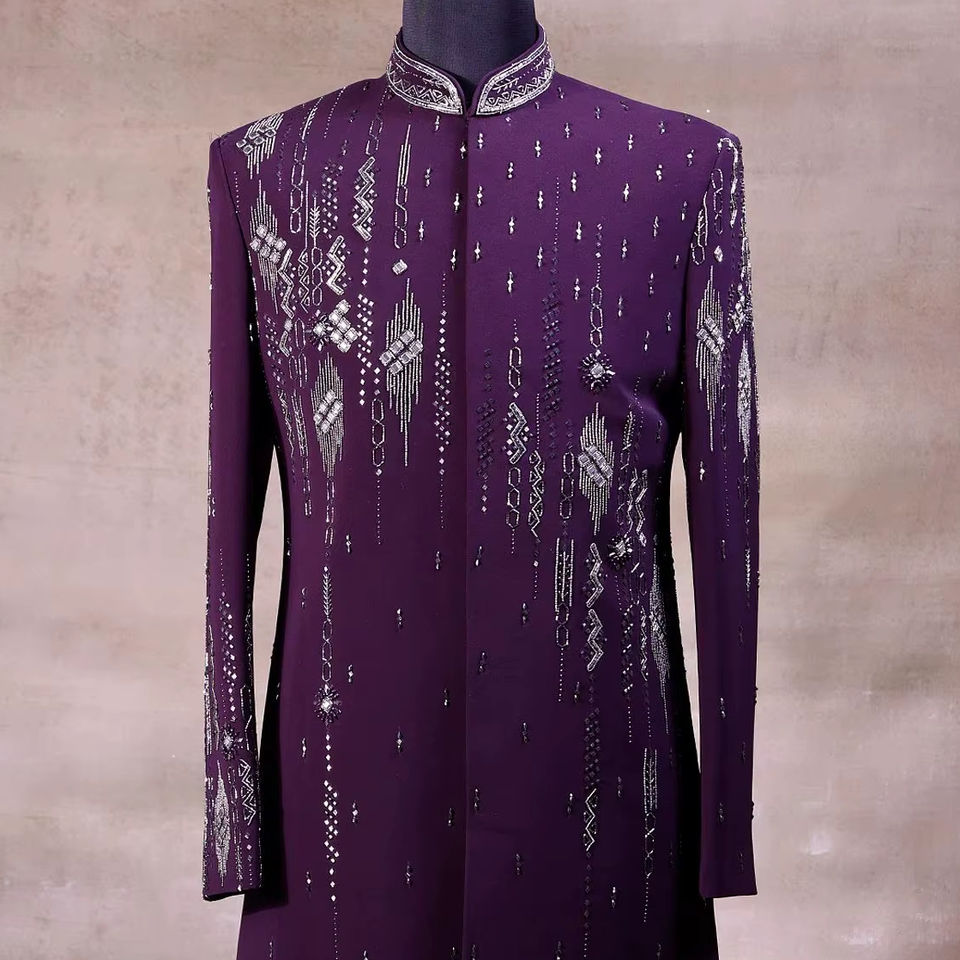 2025 @ สำหรับผู้ชายชุดเดรสผ้าเชอร์วานีสีม่วงและกางเกงประดับด้วยลูกปัดแก้วคริสตัลชุดใส่ทำงานสำหรับงานแต่งงานงานปาร์ตี้
