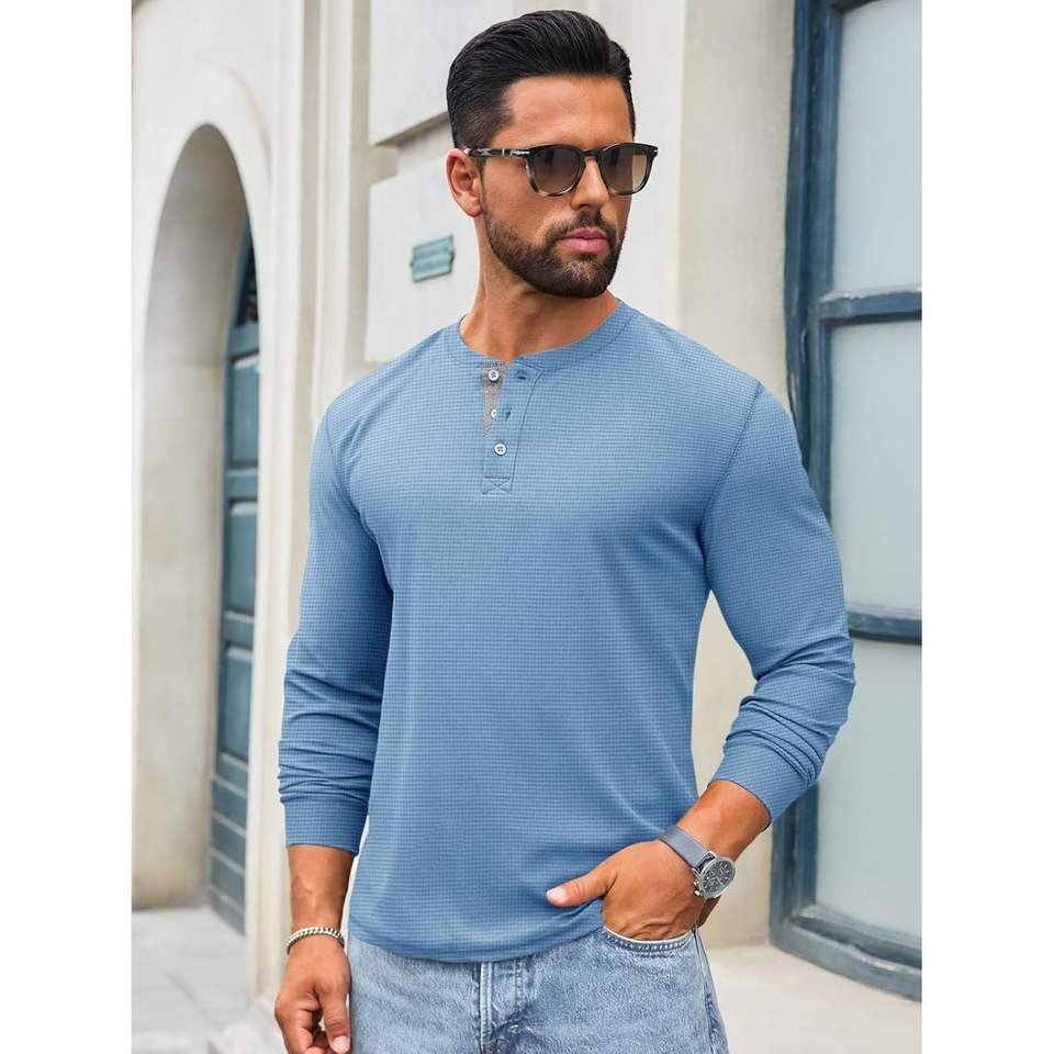 Henley เสื้อเชิ้ตแขนยาวลำลองผู้ชาย, เสื้อเบสิกลำลองน้ำหนักเบาดีไซน์2025พร้อมกระดุมวาฟเฟิล