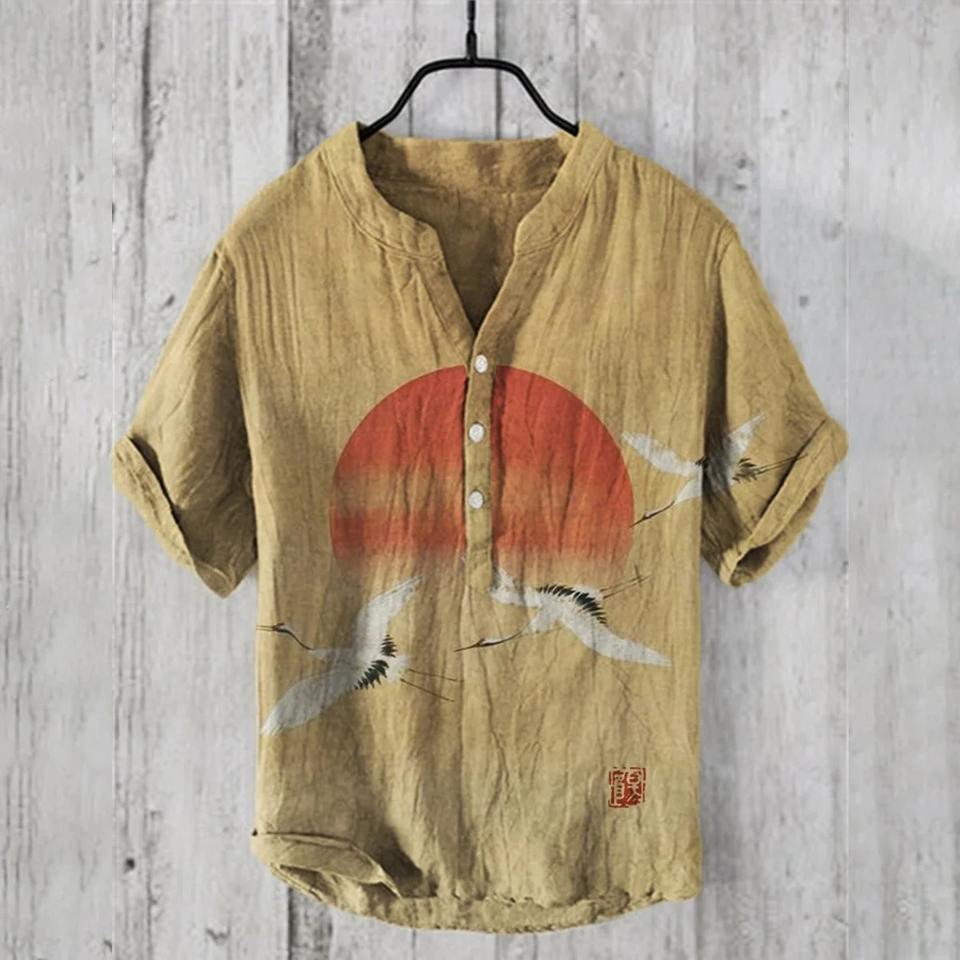 2025เสื้อยืดผู้ชายผ้าลินินทรงหลวมลำลอง, เสื้อเชิ้ตไซส์ใหญ่แขนสั้นคอวีลายหมึก S-5XL