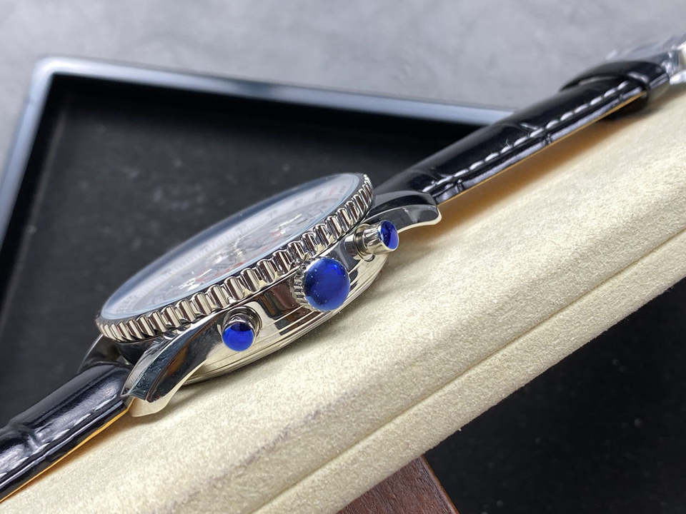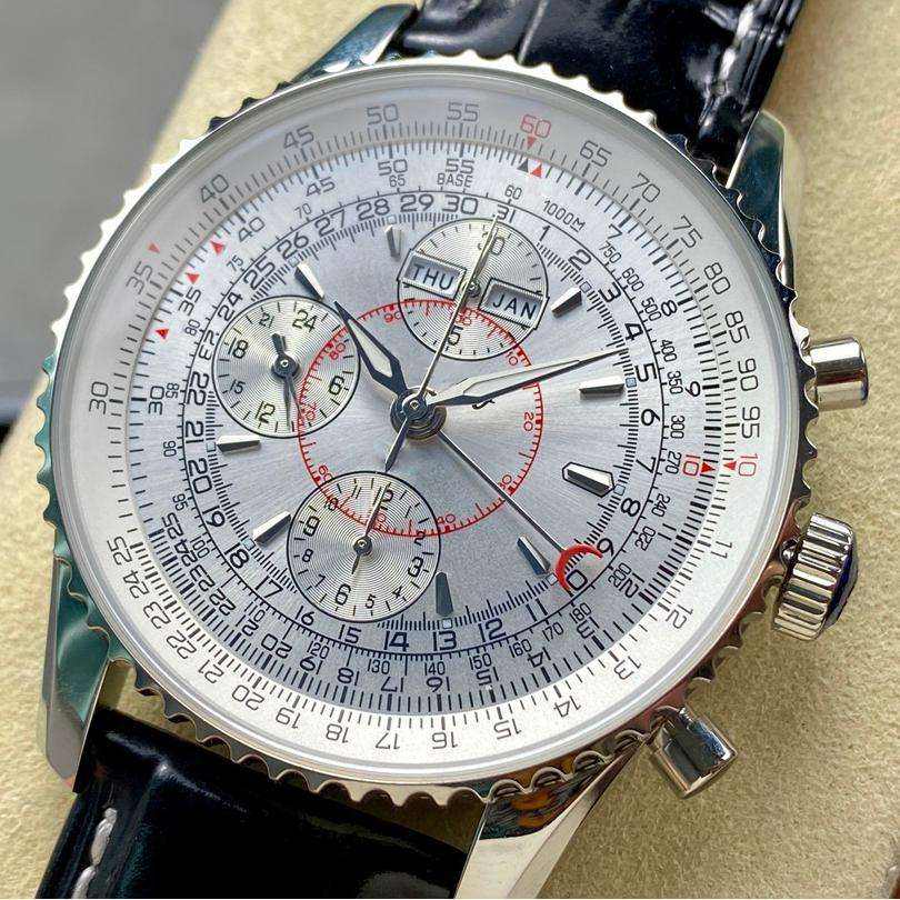 นาฬิกาโครโนกราฟผู้ชายสุดหรู ปี 2025 ขนาด 42 มม. หน้าปัดสีเงิน กันน้ำ ฟังก์ชั่นหลากหลาย แสดงวันที่และวันในสัปดาห์ สายหนังสั่งทำพิเศษขนาด 22 มม.