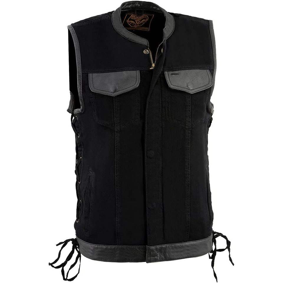 เสื้อกั๊กหนังสีดำ MDM3011ของผู้ชาย, เสื้อกั๊กผ้าเดนิมผูกเชือกข้างรถจักรยานยนต์แต่งขอบด้วยหนัง