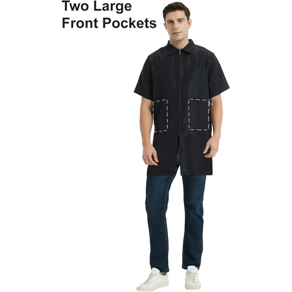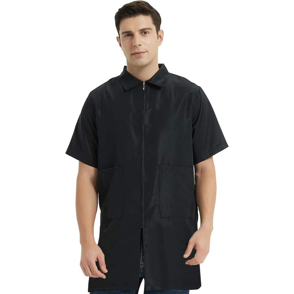 เสื้อแจ็กเก็ตช่างตัดผมแขนสั้นสีดำสำหรับผู้ชาย2025ซักได้