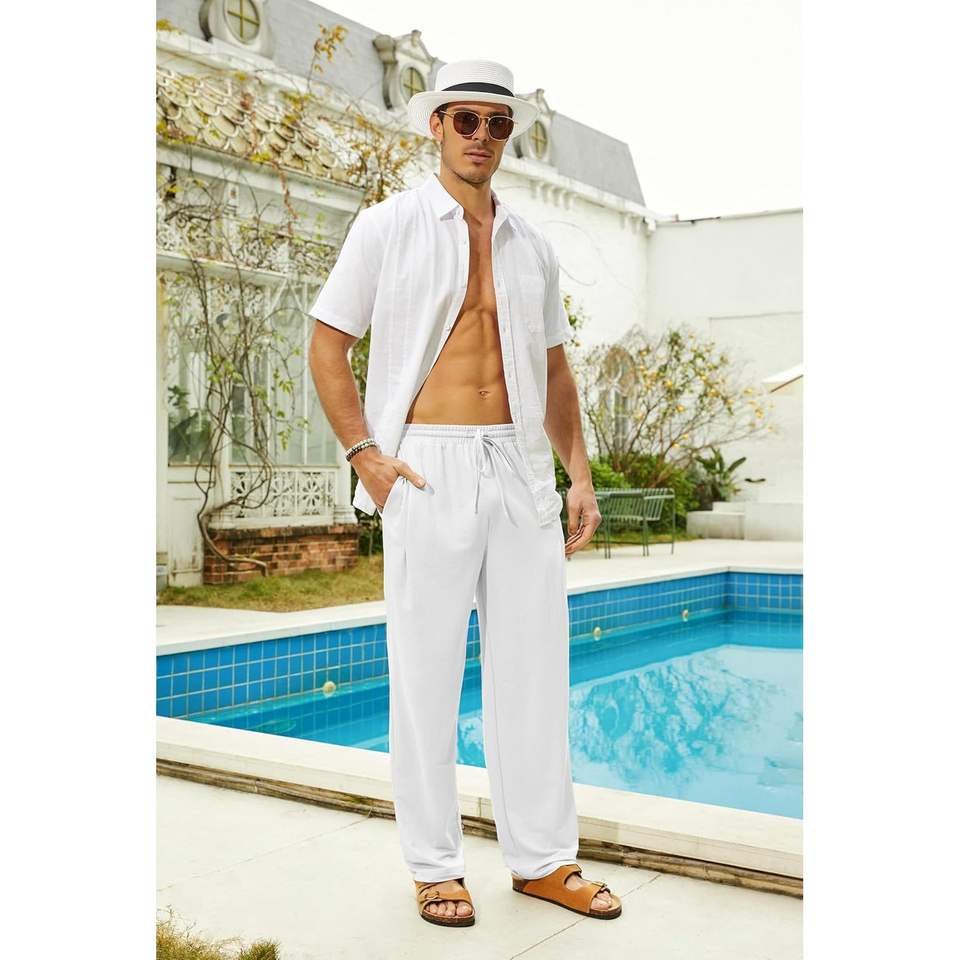 2025กางเกงผู้ชายมีเชือกผูกผ้าลินินชายหาดกางเกงโยคะลำลองฤดูร้อน