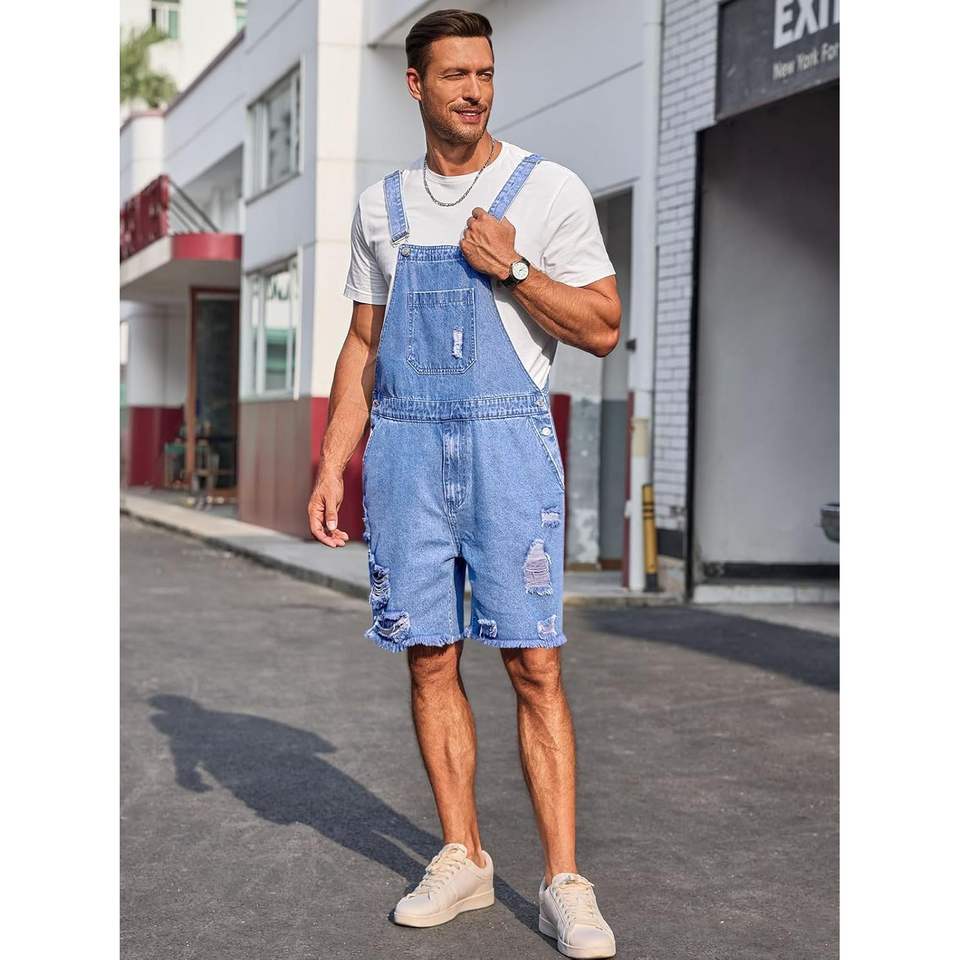 2025ชุดจั๊มสูททำงานของผู้ชายสำหรับฤดูร้อนจั๊มสูททรงหลวมแบบขาดเป็นริ้วกางเกงยีนส์ขาสั้นโดยรวมสามารถปรับสายได้เย็บปัก