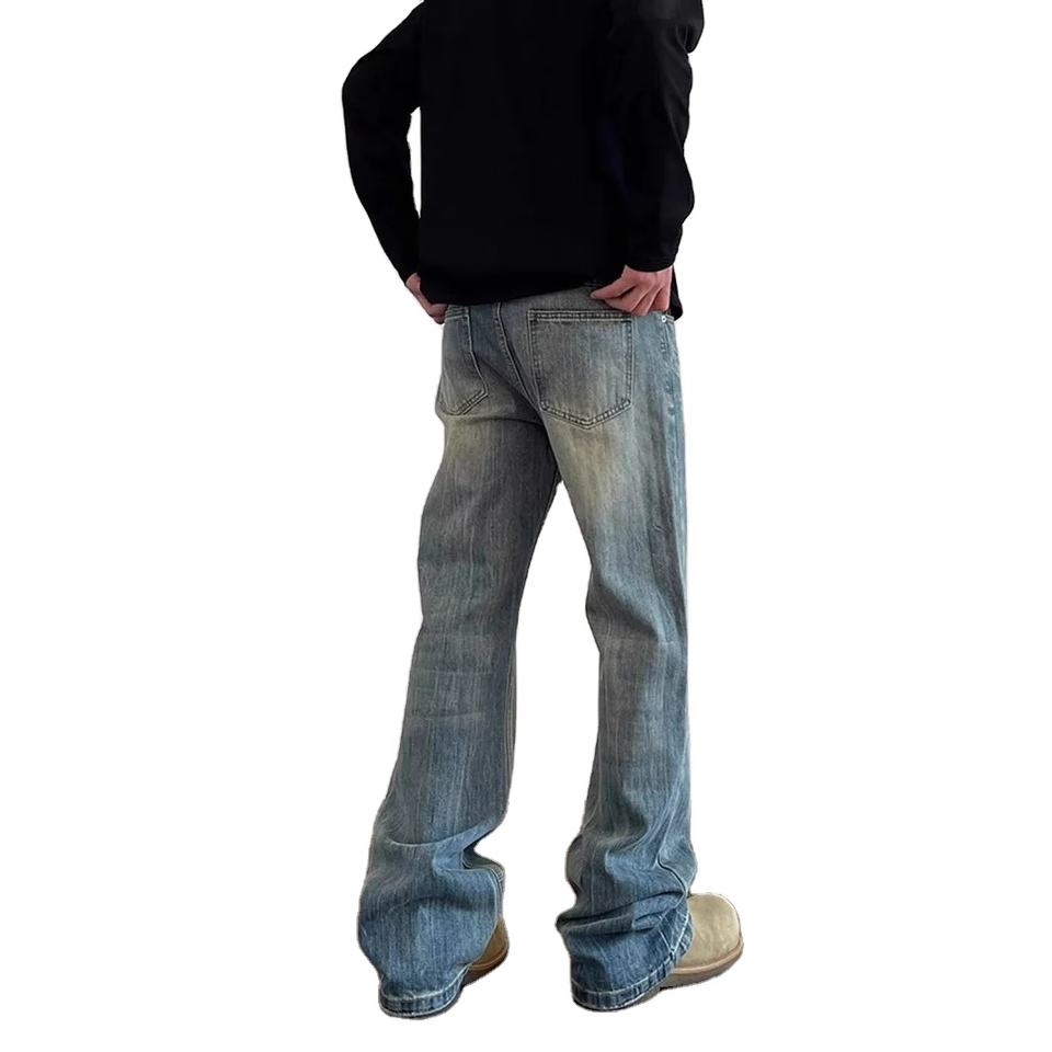 กางเกงยีนส์ผู้ชายสไตล์วินเทจสุดเทรนด์ประจำปี 2025 ทรงหลวมขาตรง เอวกลาง ซักได้ ลายเรียบ สีซีดปานกลาง ผ้าทอสำหรับฤดูใบไม้ร่วง