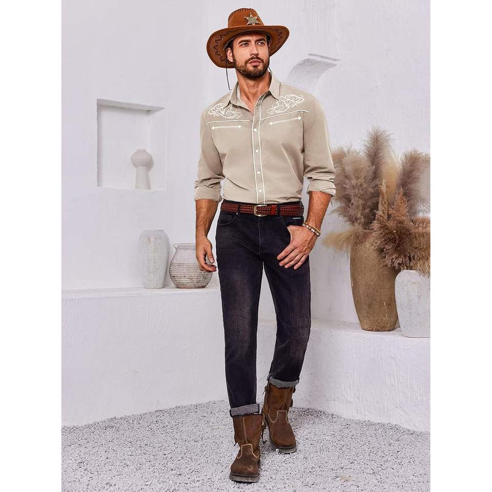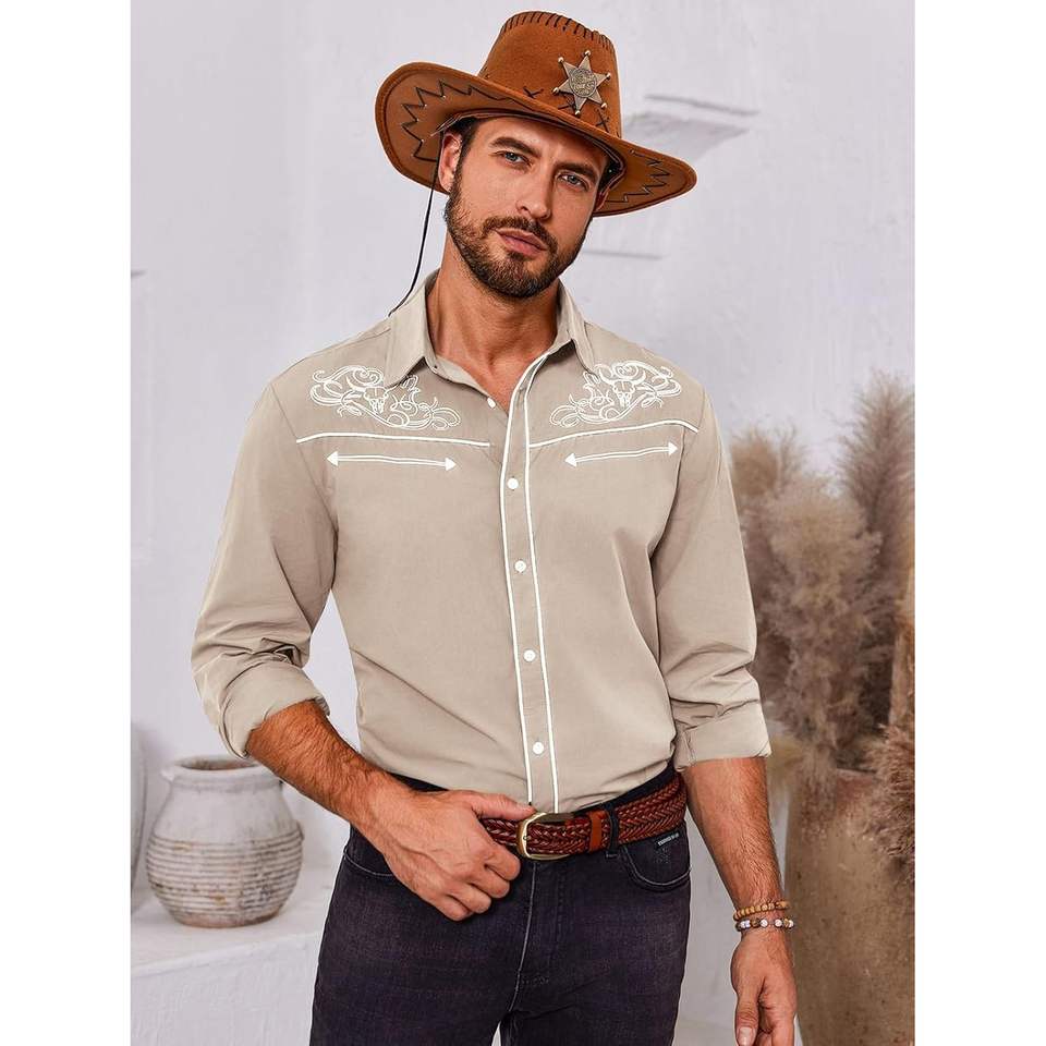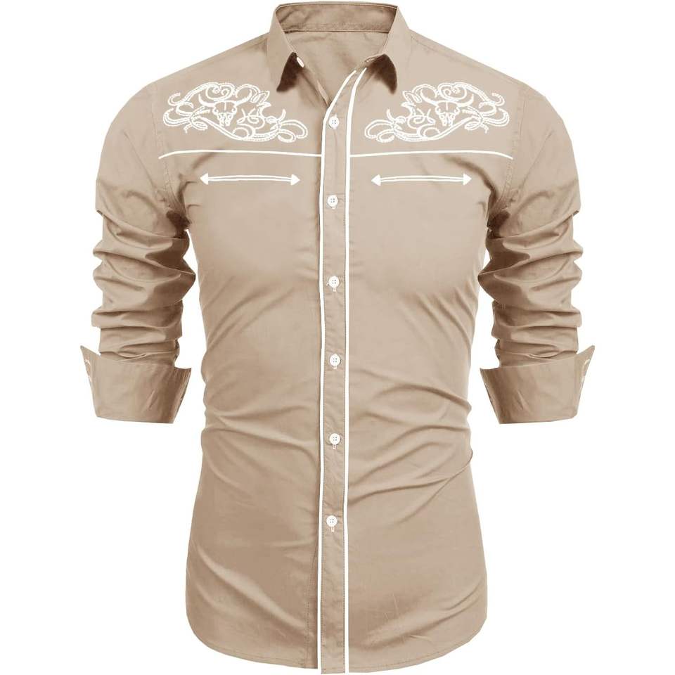 2025ชุดเดรสคาวบอยตะวันตกของผู้ชาย, ผ้าฝ้าย100% ทอแขนยาวปักกระดุมลำลองเข้ารูปสไตล์วินเทจ