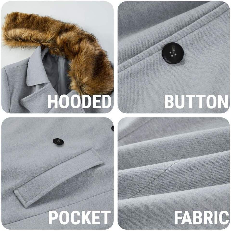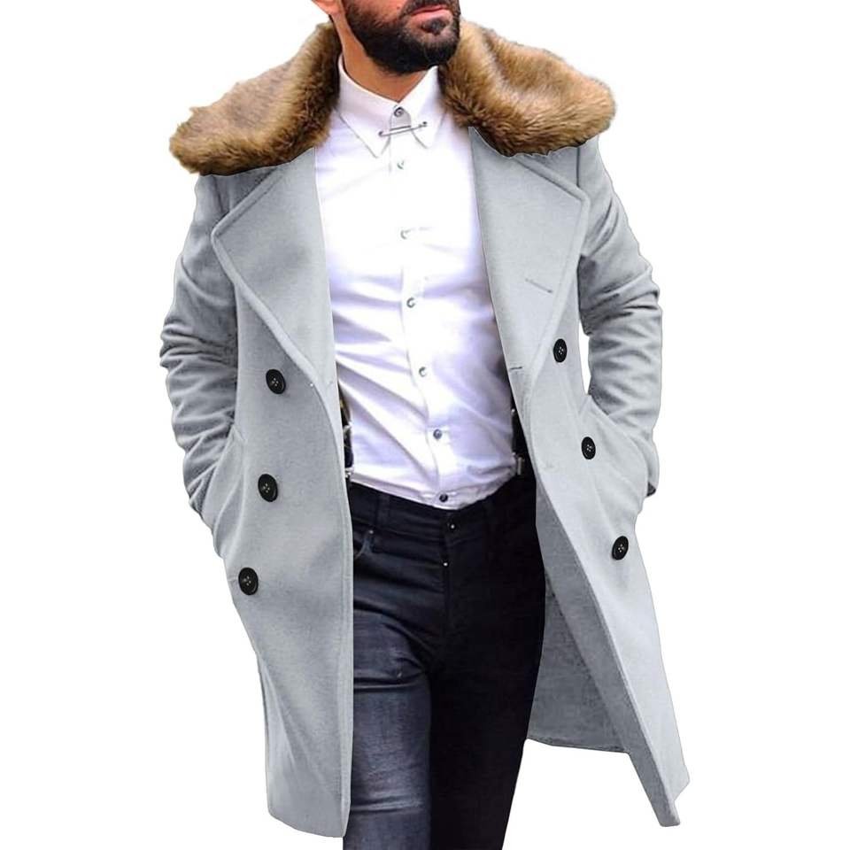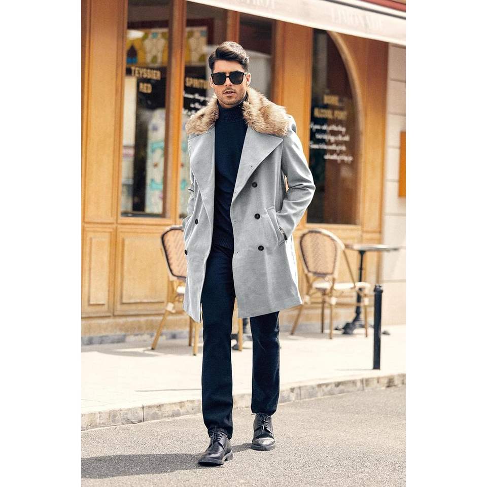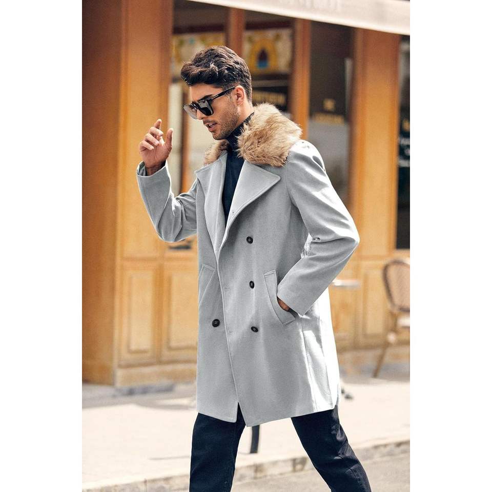 2025 Men's Winter Double Breasted Business Long Pea Coat with Removable Faux Fur Collar Top Single Breasted Overcoat