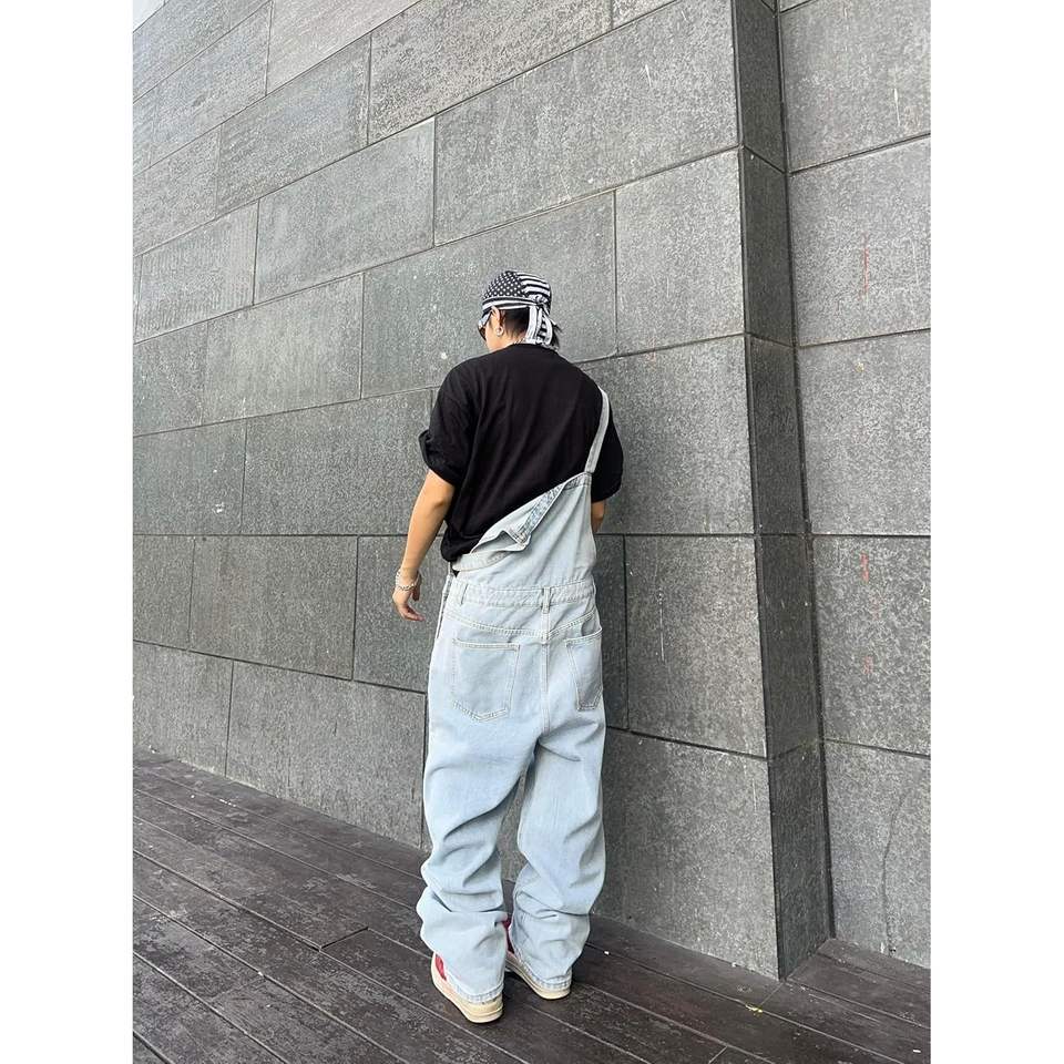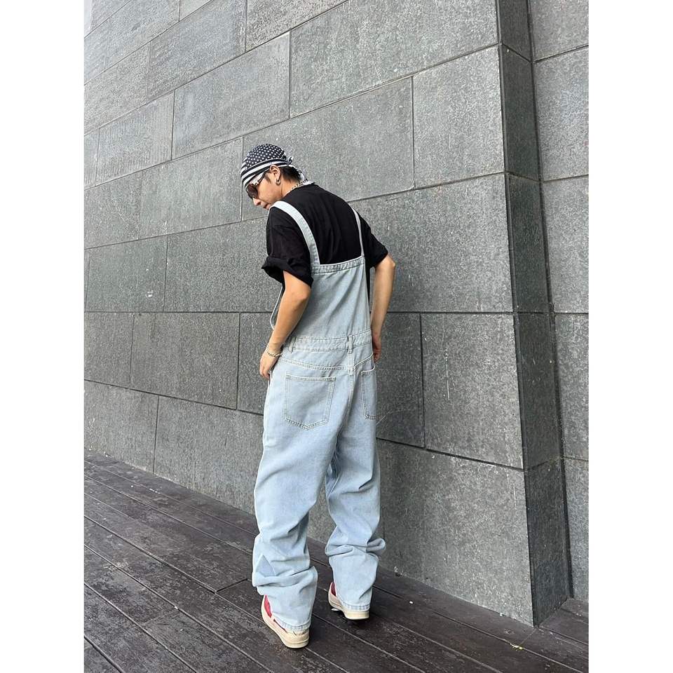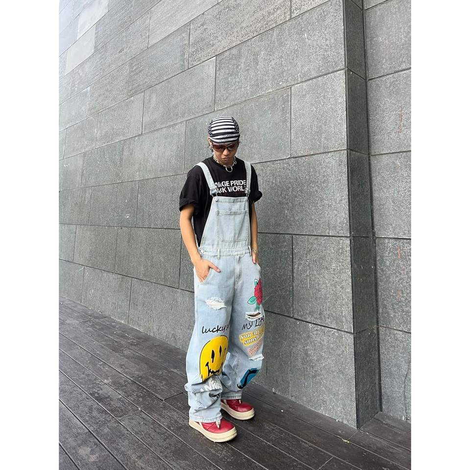 2025ชุดจั๊มสูทผ้ายีนส์แบบขาดมีกระเป๋าหน้ายิ้มน่ารักของผู้ชายผู้หญิงชุดเอี๊ยมผ้าเดนิมแบบลำลองมีกระเป๋าฤดูร้อน