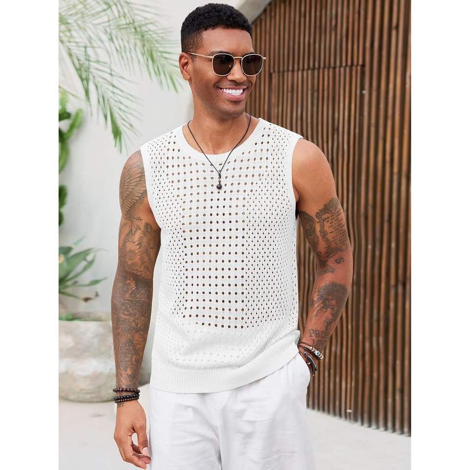 2025เสื้อกล้ามถักแขนกุดผู้ชาย XL เสื้อลำลองกลวงออกฤดูร้อนเสื้อยืดชายหาดมีฮู้ดแบบเรียบๆลายผ้าทอ