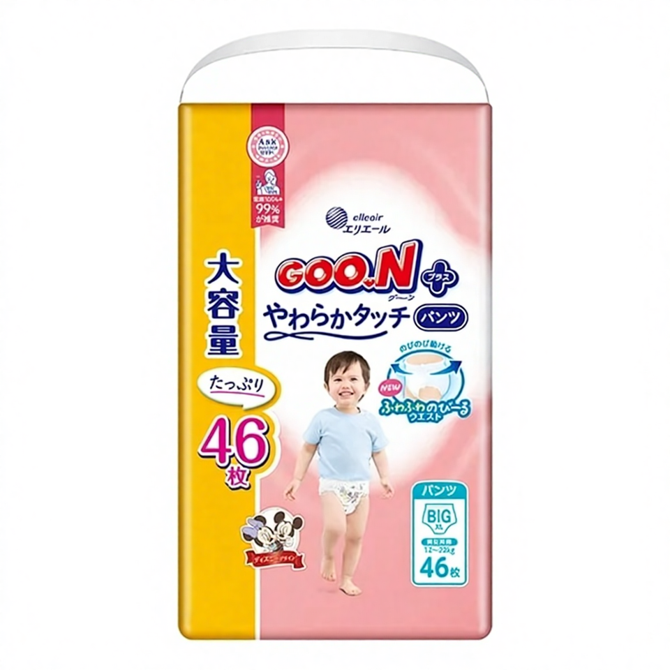 ผ้าอ้อมเด็กกันรั่วซึมแบบใหม่ ปี 2025 รุ่น Goon Plus Soft Touch XL แพ็คใหญ่ 46 ชิ้น สำหรับผิวบอบบาง ผลิตในญี่ปุ่น ดีไซน์สนุกๆ ขายส่งจำนวนมาก