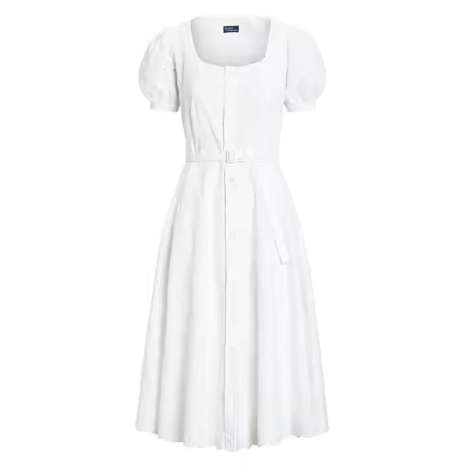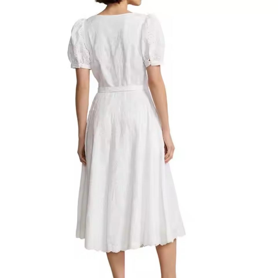 เดรสสีขาวบริสุทธิ์สไตล์ผู้หญิงรุ่นใหม่ปี 2025 ดีไซน์หรูหราสไตล์โบฮีเมียนลำลอง ตกแต่งด้วยลายปักตาไก่ ผ้าลินิน แต่งเข็มขัด ตัดต่อผ้าแบบแพทช์เวิร์ค สำหรับฤดูร้อน