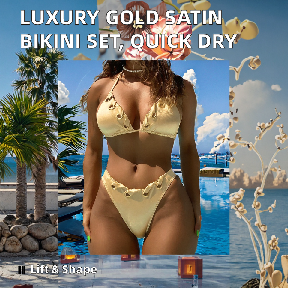ชุดบิกินี่ 2 ชิ้น รุ่นใหม่ปี 2025 ผ้าซาตินสีทองหรูหรา ไซส์พลัส ป้องกันแบคทีเรีย ระบายอากาศได้ดี แบบผูกคอ ดันทรง พร้อมลายพิมพ์แบบโปร่ง