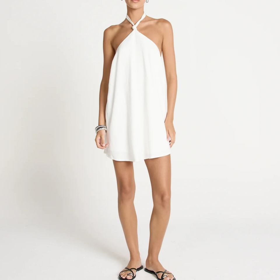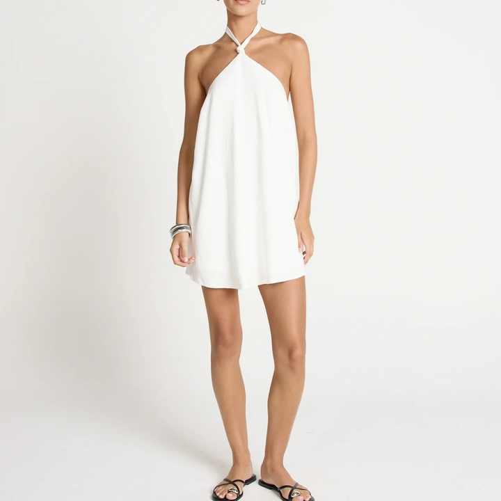 2025 New Arrival Wholesale Women High Neck Low Back Sexy Linen Dress Relaxed Fit Casual Beach Mini Dresses