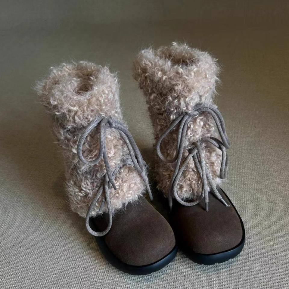 รองเท้าบูทขนเฟอร์แบบสวม รุ่นใหม่ปี 2025 สำหรับผู้หญิง มีสินค้าพร้อมส่ง รองเท้าบูทข้อเท้าแบบผูกเชือกสไตล์เรโทร บุขนแกะ อุ่นสบายสำหรับฤดูหนาวและหิมะ