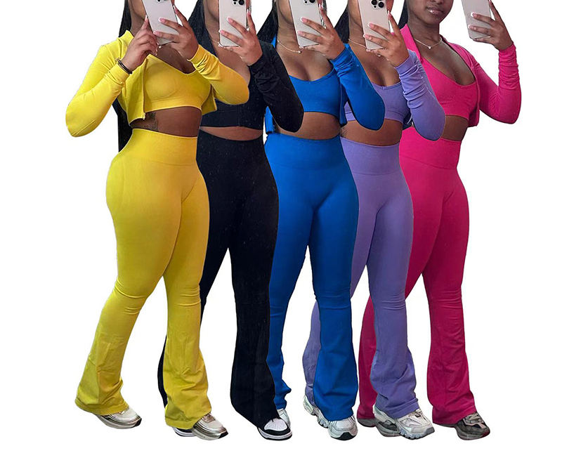 ชุดออกกำลังกายกางเกงครอป3ชิ้นสำหรับผู้หญิงชุดออกกำลังกายสีล้วนสำหรับฤดูใบไม้ผลิฤดูร้อน2025