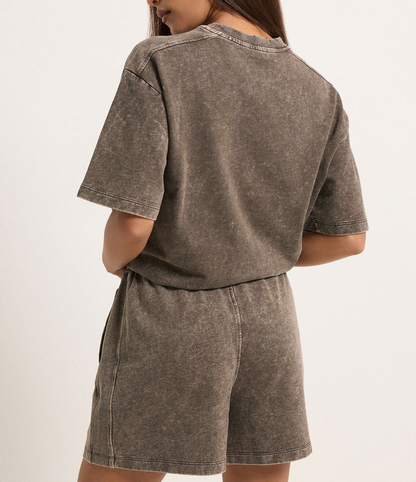เสื้อยืดและกางเกงขาสั้นผ้าเจอร์ซีย์คอตตอน 100% ล้างสีแบบแอซิดวอช รุ่นใหม่ปี 2025 สำหรับผู้หญิง ทรงหลวม แฟชั่น น้ำหนักเบา ชุดลำลองฤดูร้อน