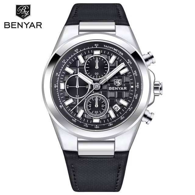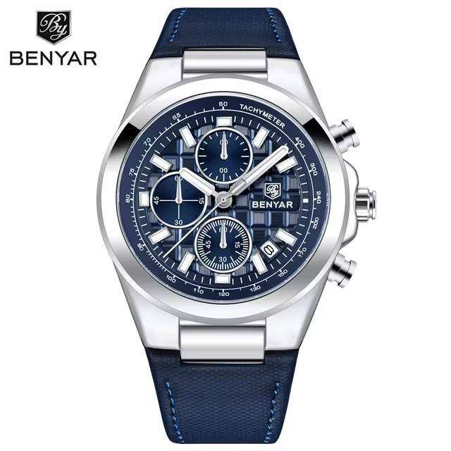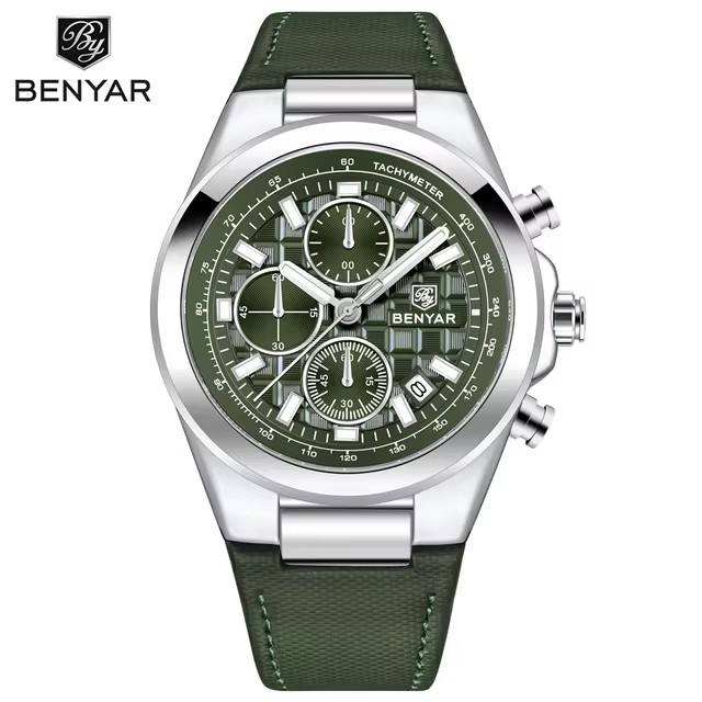 Benyar 5206 2025นาฬิกาควอตซ์โครโนกราฟสำหรับผู้ชายสายหนังดีไซน์เรียบง่ายกันน้ำได้สำหรับกีฬาเรืองแสง