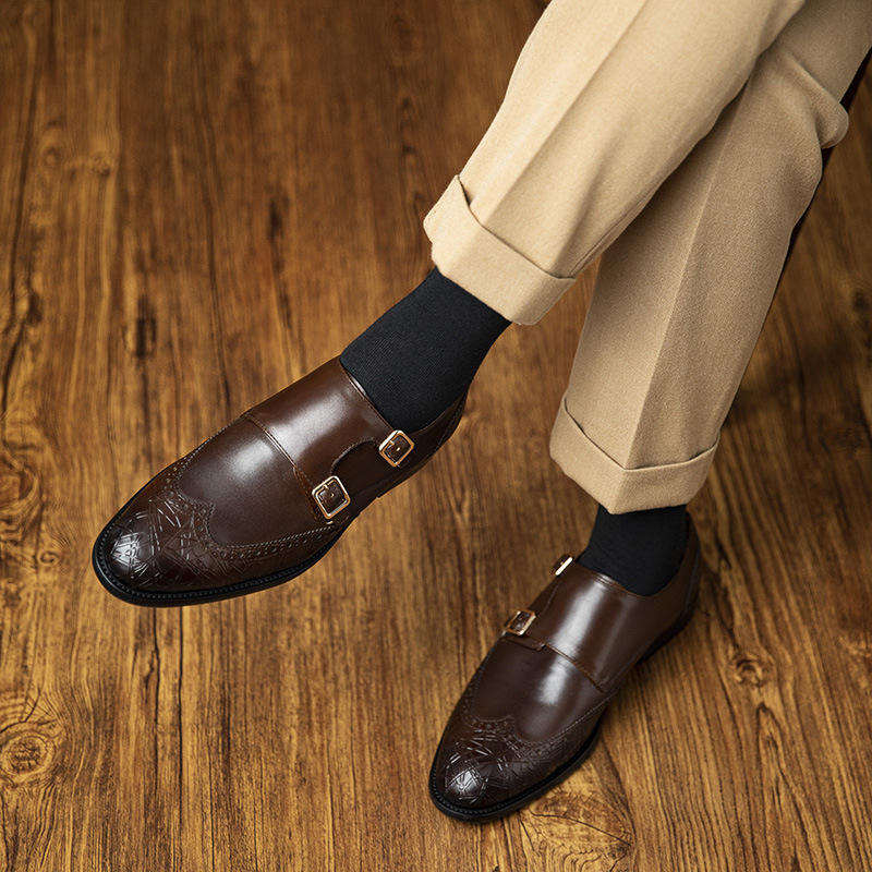รองเท้าหนังแท้สไตล์อังกฤษใหม่ ปี 2025 - รองเท้าทรงอ็อกซ์ฟอร์ดหัวมนแบบเรโทร ลายปักลายนูน พร้อมสายรัดแบบ Monk Strap สำหรับผู้ชาย สไตล์หรูหราสำหรับงานทางการ