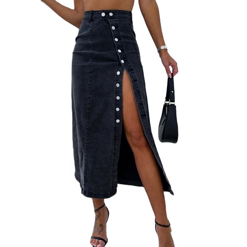 2025ใหม่กระโปรงยีนส์ผ่าครึ่งกระดุมแหวกแนวเอวสูงกระโปรงสะโพกทรงบาง