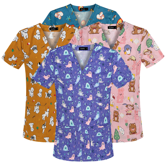 เสื้อคอตตอนแท้พิมพ์ลาย2025เสื้อการ์ตูนเสื้อทำงานเสื้อยูนิฟอร์มพยาบาลลายคริสต์มาสดีไซน์ใหม่