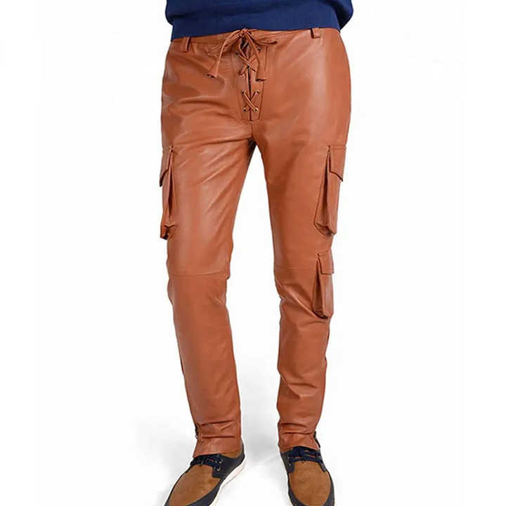 2025 New Design Men's Winter Breathable Casual Leather Cargo Pants Big Pocket Oxford Fabric Embroidered Flat Front