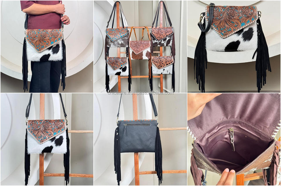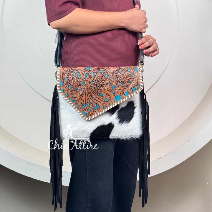 Product name:Hand Tooled Cowhide Leather Fringe Crossbody Bag