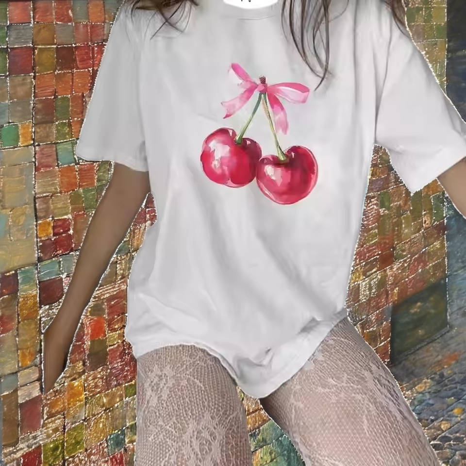 เสื้อครอปพิมพ์ลายเชอร์รี่สไตล์ยุโรปอเมริกาใหม่ปี 2025 สำหรับเด็กผู้หญิงและผู้หญิง เสื้อผ้าลำลองน่ารัก ทรงหลวม ผ้าเจอร์ซีย์ ไม่เป็นขุย ใส่ได้ทุกวัน