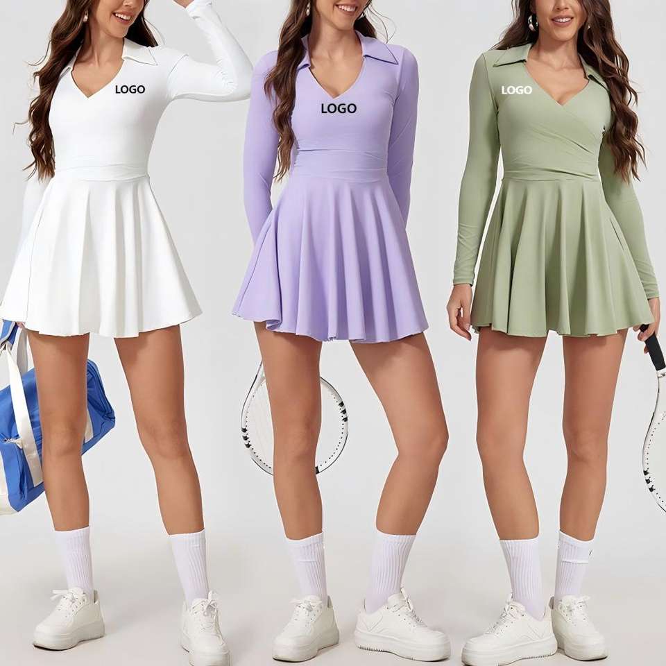 ชุดเดรสเทนนิสกอล์ฟแบบสวมใส่สบาย แห้งเร็ว ระบายอากาศได้ดี ยืดได้ 4 ทิศทาง เป็นมิตรกับสิ่งแวดล้อม ปี 2025 คอวี แขนยาว พร้อมกระโปรงสั้นในตัว