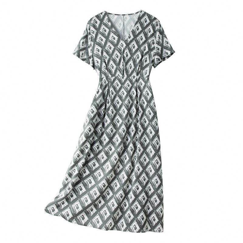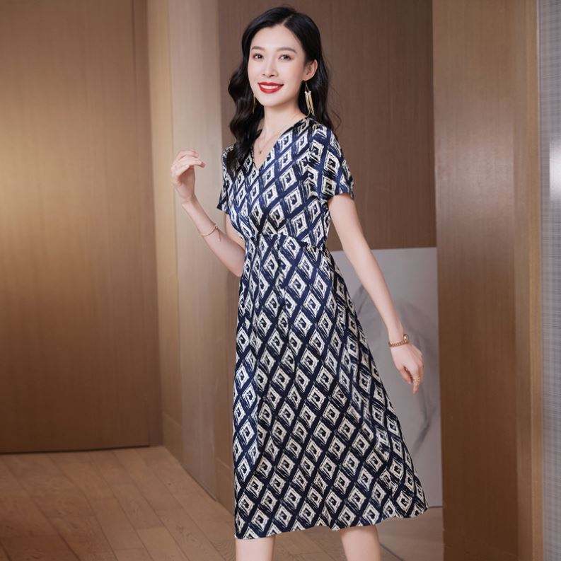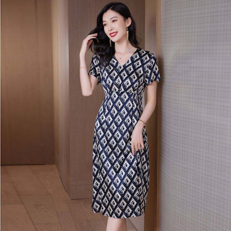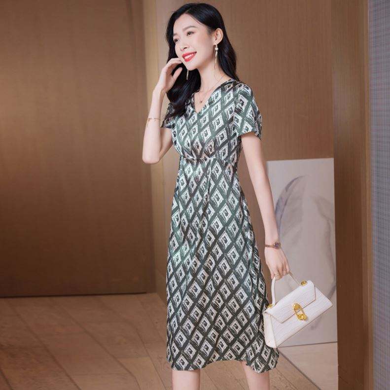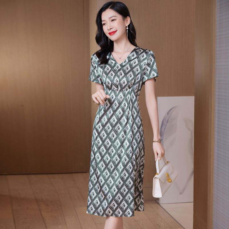 2025ใหม่ชุดเดรสผ้าซาตินเอวสูงลายดอกไม้หรูหราสำหรับผู้หญิงหังโจวเดรสยาวคอวีพิมพ์ลายดิจิตอล