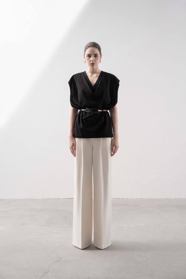 2025 New Elegant Women 2 Piece Set Black Sleeveless V Neck Belted Top and White Wide Leg Pants Mini Korean Style Office Outfit