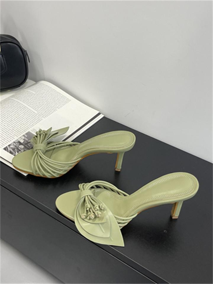 รองเท้าส้นสูงแบบสวมแฟชั่นใหม่ปี 2025 สไตล์ยุโรปและอเมริกา ประดับดอกไม้สีเขียว เปิดนิ้วเท้า ส้นเข็ม
