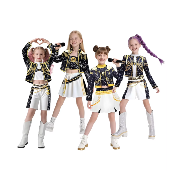 2025ใหม่ชุดฮาโลวีนสำหรับเด็กผู้หญิงชุดนักล่าปีศาจชุดนักร้องยอดนิยมสำหรับเด็กผู้หญิงตัวเล็กชุดเสื้อผ้าสีดำทองแบบกลุ่ม