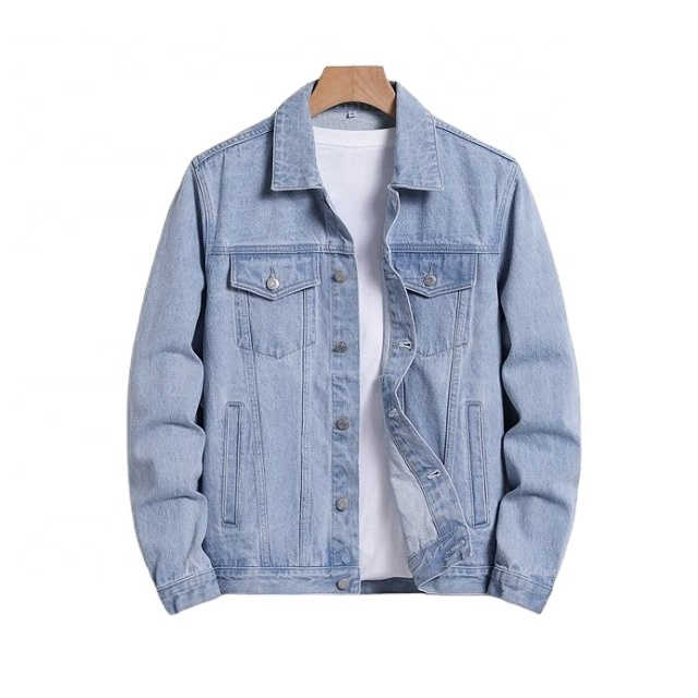 แจ็คเก็ตยีนส์สีน้ำเงินคุณภาพสูงปี 2025 ออกแบบโลโก้เองได้ ผ้าฝ้าย 100% สำหรับผู้ชาย ขายส่งแบบ OEM แจ็คเก็ตผ้าแคนวาส