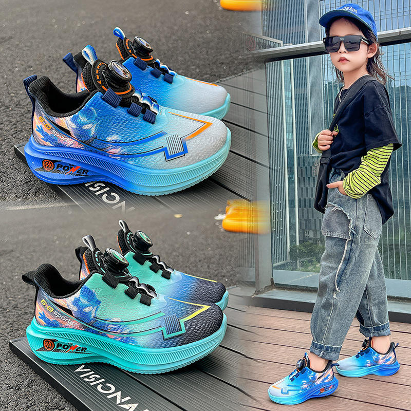 รองเท้ากีฬาเด็กผู้ชายรุ่นใหม่ปี 2025 รองเท้าผ้าตาข่ายสำหรับวิ่ง ฤดูใบไม้ผลิ/ฤดูใบไม้ร่วง ไซส์กลาง-ใหญ่ ปุ่มหมุน สีฟ้า/เขียว