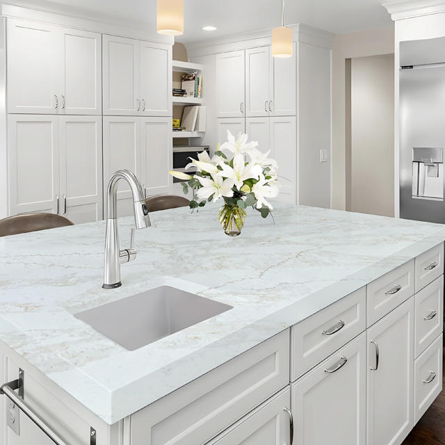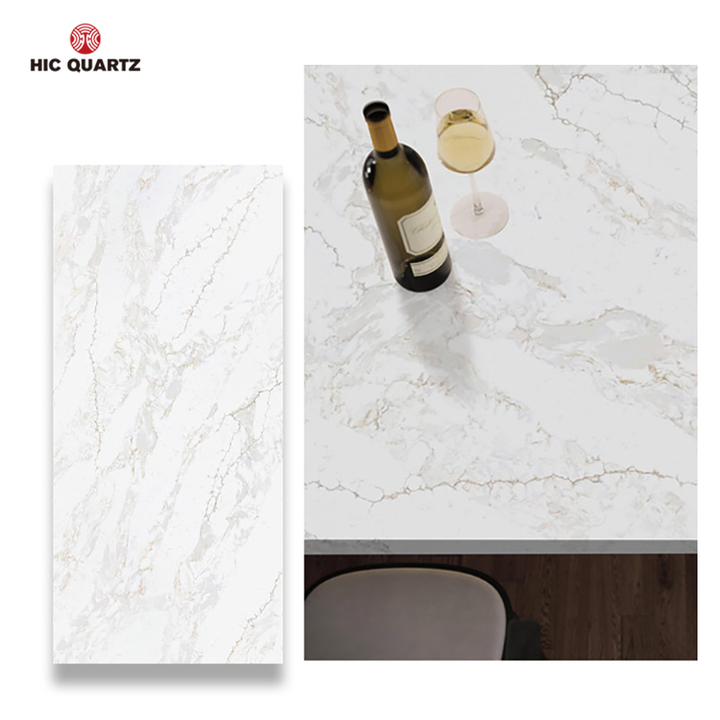 แผ่นควอตซ์เทียมลายคาลาคัตต้าสีขาวทันสมัยปี 2025 ขนาดใหญ่ สำหรับเคาน์เตอร์ โต๊ะ พื้นภายในบ้าน ห้องครัว ห้องน้ำ โรงแรม กันน้ำ