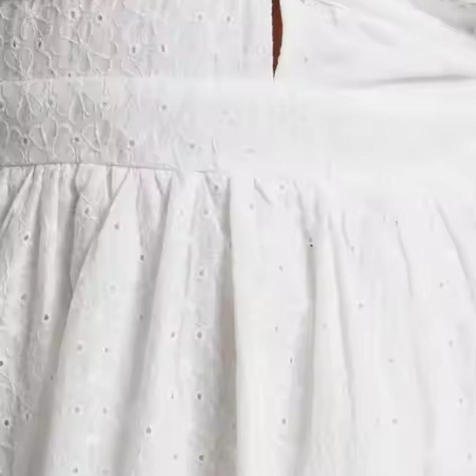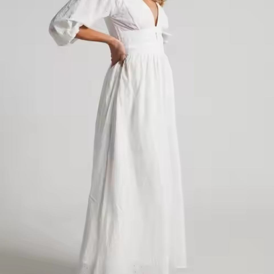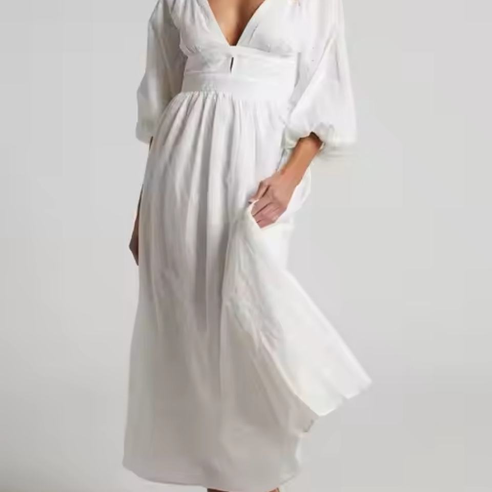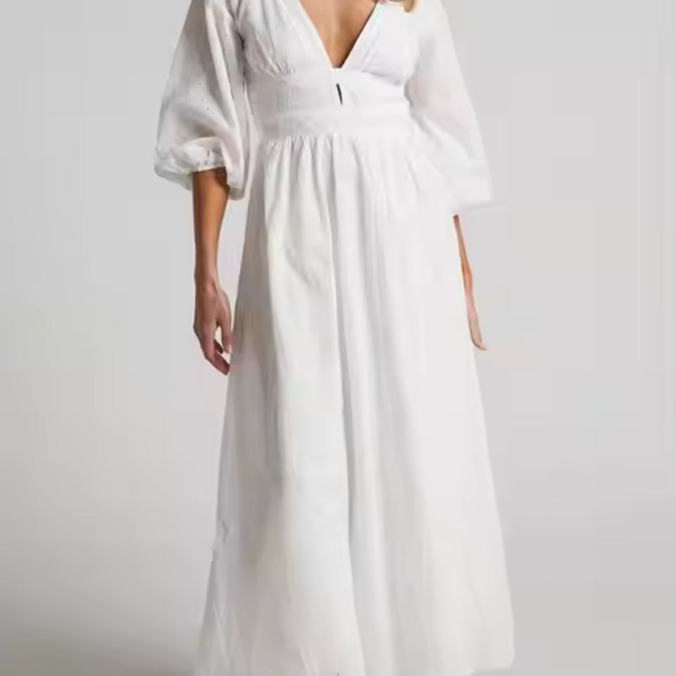 เดรสยาวลำลองสีขาวผ้าฝ้ายลินินคอวีโชว์หลัง ดีไซน์หรูหราพร้อมโลโก้สั่งทำแบบใหม่ปี 2025 สำหรับผู้หญิง