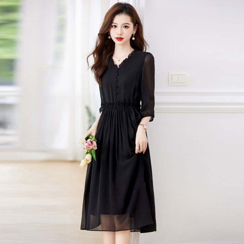 ชุดเดรสคอวียาวปานกลางสไตล์ใหม่สำหรับผู้หญิงชุดเดรสปาร์ตี้ผ้าชีฟองผ้าไหมธรรมชาติสำหรับฤดูร้อน2025