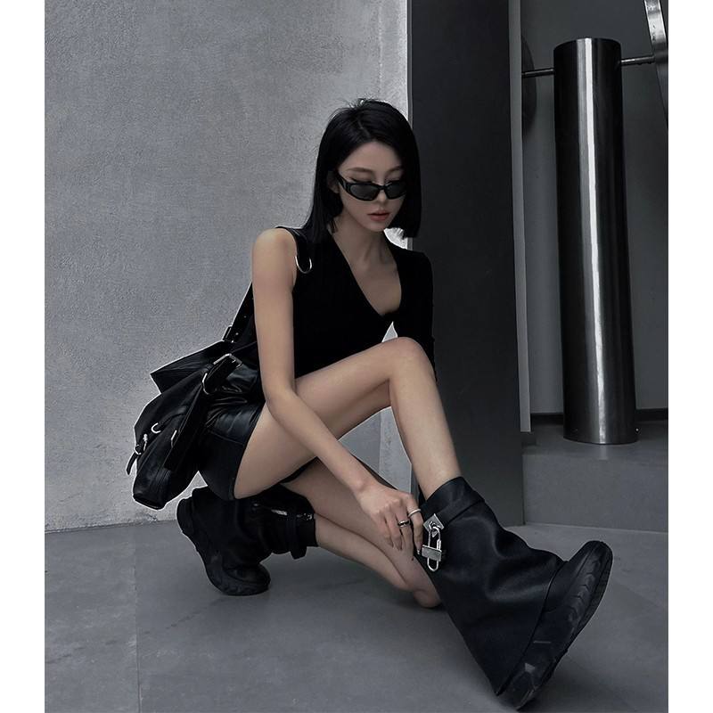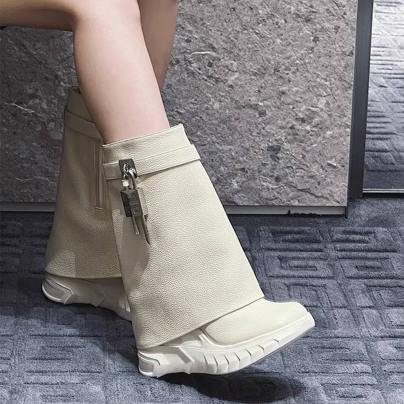 รองเท้าบูททรงฉลามสไตล์ใหม่ปี 2025 สำหรับผู้หญิง พื้นหนา ตัวล็อคโลหะ พร้อมคุณสมบัติเพิ่มความสูง สำหรับฤดูหนาว