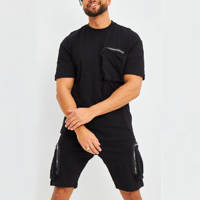 2025 New Summer Men 2 Piece Short Set Gym Training Short Sleeve with Zipper Pockets Short Custom Twin Short Set