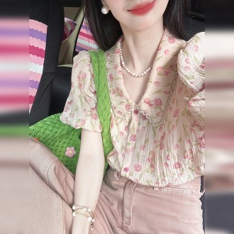 2025 New Unique Pink Flower Chiffon French Design Blouse Women's Short Sleeve Puff Top Shirt