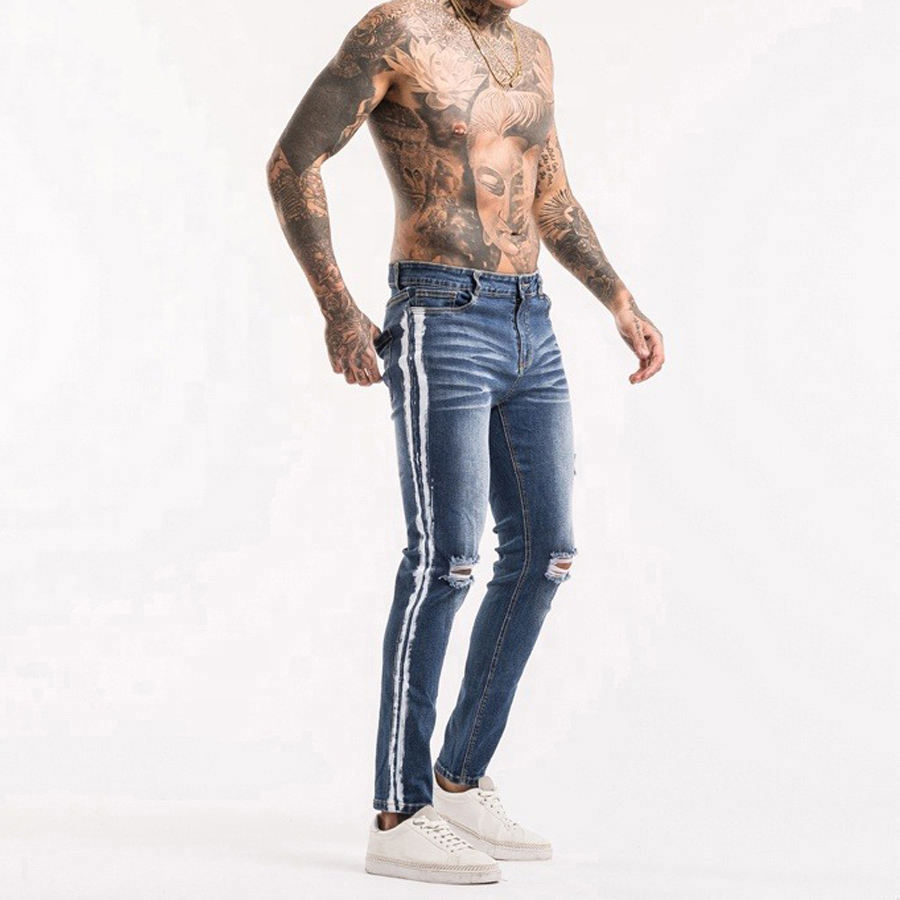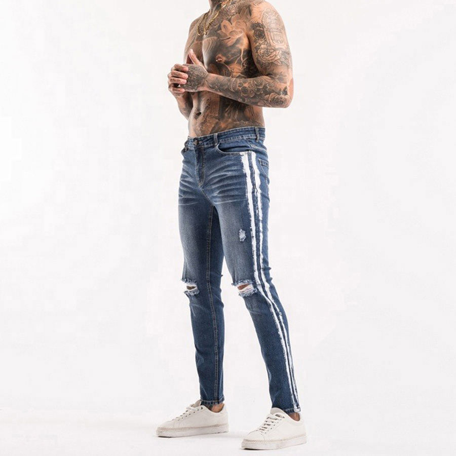 2025 New Wholesale Brand New White Stripes Ripped Denim Slim Fit Wear Jeans Fabrics Bulk for Men