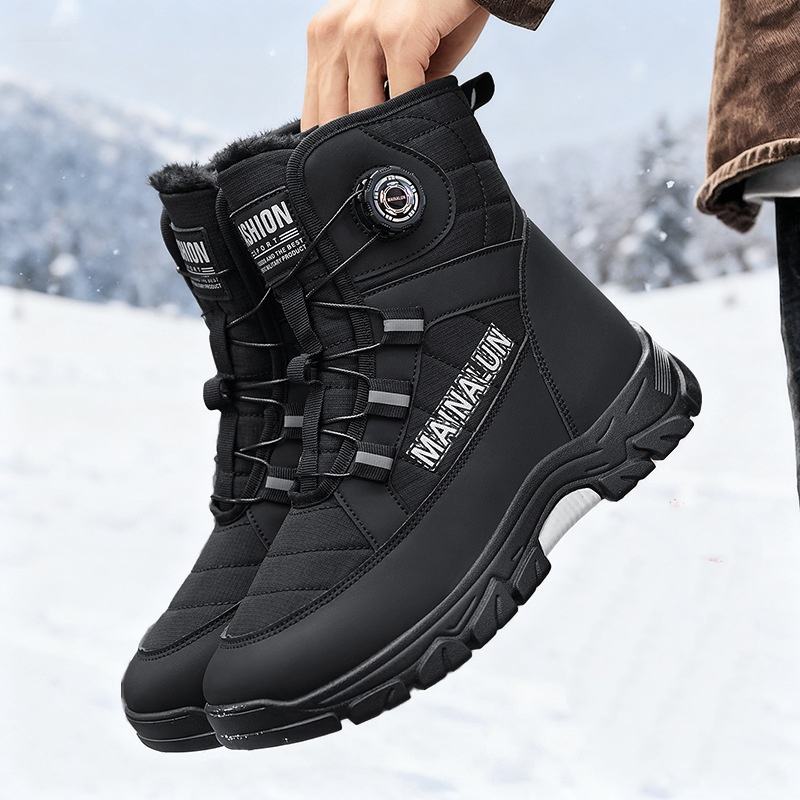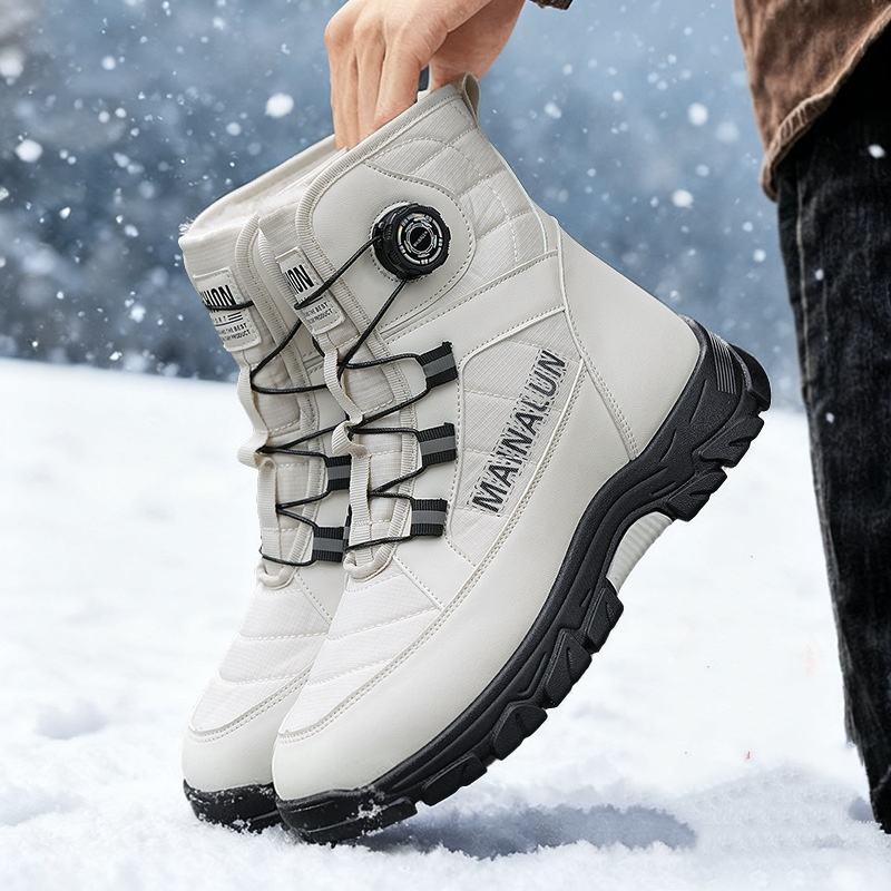 รองเท้าบูทหิมะผู้ชายฤดูหนาวปี 2025 รองเท้าเดินป่ากลางแจ้งฤดูหนาว หัวมน ผ้าตาข่ายด้านบน พื้นรองเท้า PVC บุขนหนานุ่ม อุ่น