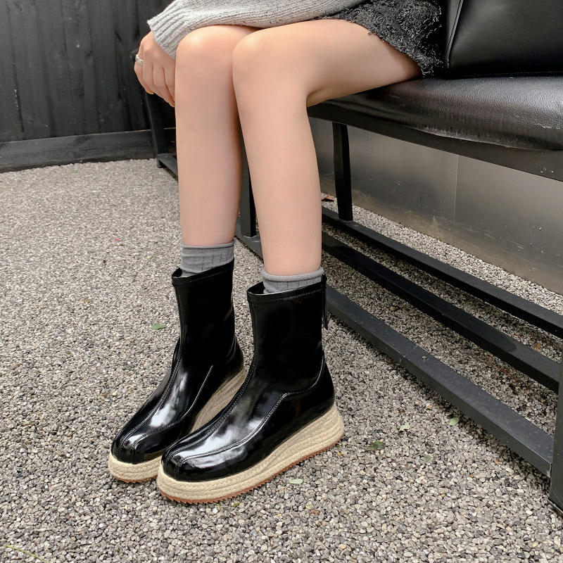 รองเท้าบูทแฟชั่นข้อเท้าทรงคลาสสิกหัวเหลี่ยมส้นหนาสำหรับผู้หญิงปี 2025 ผ้าไมโครไฟเบอร์บุขนสไตล์อังกฤษสำหรับฤดูใบไม้ร่วงและฤดูหนาว