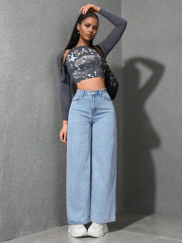 กางเกงยีนส์ขากว้างของผู้หญิงกางเกงยีนส์ขาตรงเอวสูงระบายอากาศได้ดีสีอ่อนใหม่2025