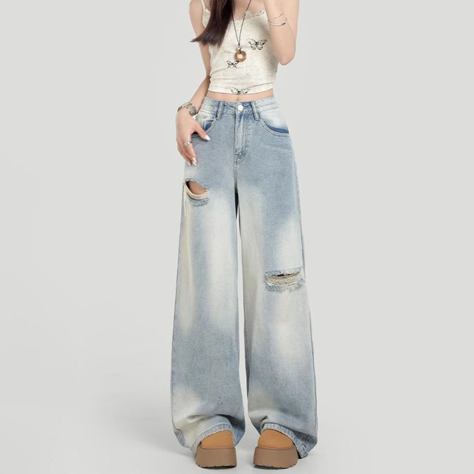 กางเกงยีนส์ขาดขากว้างสำหรับผู้หญิงใหม่2025ทรงหลวมกระชับสัดส่วนแฟชั่นย้อนยุคและลำลองผ้านุ่มและซักได้
