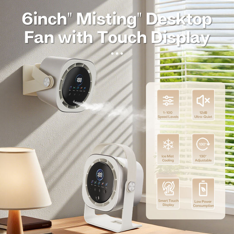 พัดลมตั้งโต๊ะแบบพ่นละอองน้ำ รุ่นใหม่ล่าสุด ปี 2025 ขนาด 6 นิ้ว ชาร์จไฟได้ผ่าน USB พกพาสะดวก พร้อมหน้าจอสัมผัส แบตเตอรี่ 3600mah พร้อมฟังก์ชั่นพ่นละอองน้ำ
