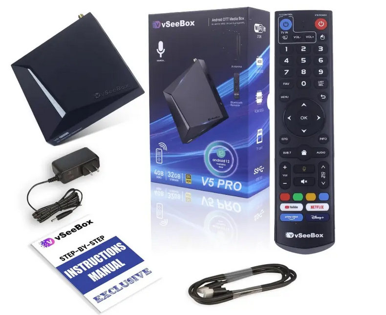 กล่องมีเดีย vSeeBox V5 Pro รุ่นใหม่ล่าสุดปี 2025 ระบบ Android 12 พร้อมรีโมทควบคุมด้วยเสียง รองรับความละเอียด 8K